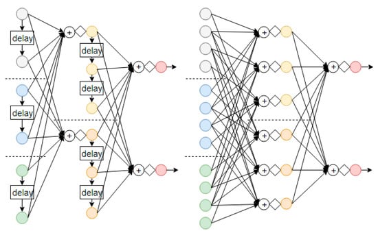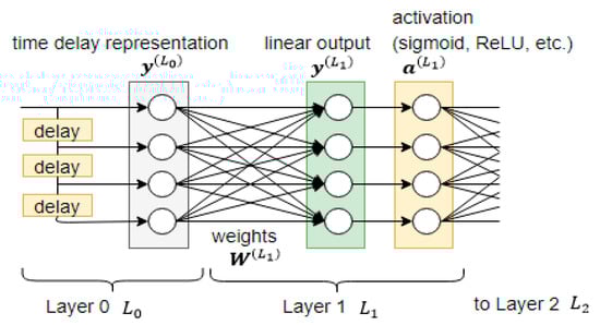 The data vector, used at the input of the neural network, can be viewed as a tapped delay line used for convolution, as shown in Figure 2. A neural network that treats its input in this way is called the time-delay neural network (TDNN). It was introduced by Waibel et al. [] and has been used in many time series applications, such as human sound location [] and the detection of Parkinson disease [].