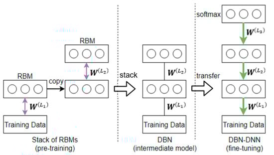 The training process of the DBN-DNN is divided into two stages, comprising the pretraining stage and the fine-tuning stage. This is shown in Figure 4 below.