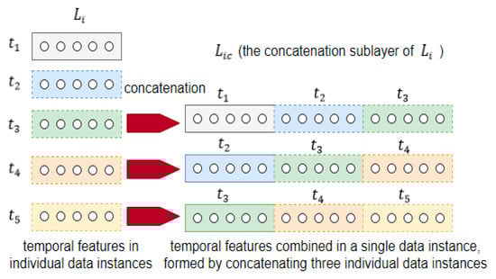 An example of the concatenation operation is shown in Figure 5 below. The figure shows 5 data instances in the layer at time , , , , and . They are combined to become the new data instances in the layer , which is the concatenation sublayer of the input in .