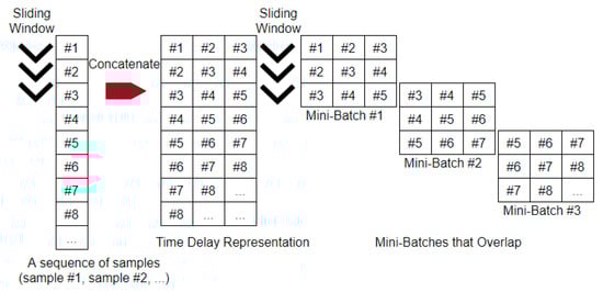 Figure 6 shows the proposed two-stage sliding window method to create mini-batches that overlap with their neighbors. On the time series, which is a sequence of samples in their time order, slide a fixed-size window along it to create the time delay representation. On the time delay representation thus created, slide another fixed-size window to create the mini-batches that overlap with each other.