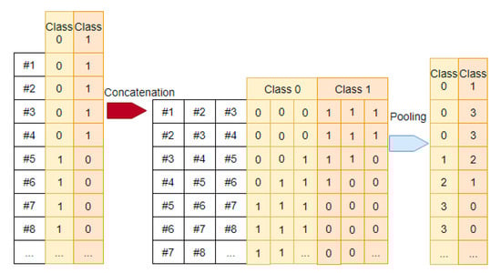 The proposed solution is to pool the count of the target labels and accumulate them through the deeper layers. The target labels are first expressed in the one-hot encoding format so that there is one category per class. This allows the count of each class to be updated after the concatenation operation, as shown in Figure 7.