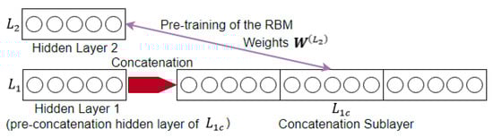 This is illustrated in Figure 8 below. In the DBN-DNN, the RBM would be between and ; but in the proposed network, the weights are located between the concatenated sublayer and the next hidden layer , and so the RBM is formed between and instead.