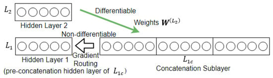 Although nondifferentiable, concatenation is an invertible operation. The proposed solution is to make use of gradient routing to unstack the concatenation, so as to link in Equation (5) to in Equation (6). The transformation that gradient routing intends to achieve is shown in Equation (7) below.