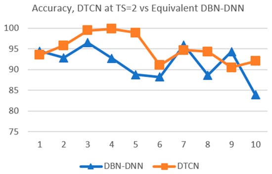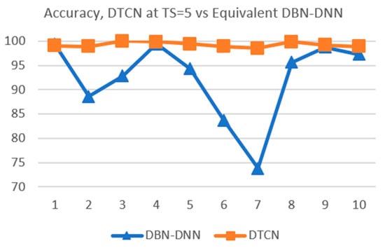 Performance of DTCN at TS = 5 vs. equivalent DBN-DNN.