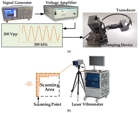 Specifically, in the subsequent experimental system, the ultrasonic transmitting component is shown in Figure 2a, including a signal generator (Tektronix AFG3152C), a voltage amplifier (Tegam Model 2340) and an air-coupled ultrasonic transducer (Ultran Group NCG200-D25). The transducer is a circular noncontact transducer with a center frequency of 200 kHz and a bandwidth of 40% of the center frequency. It is fixed by a clamping device and emits ultrasonic waves to the surface of the thin plate. The incident angle of the transducer is easy to accurately adjust. According to Snell’s law of refraction, the ultrasonic Lamb wave with a relatively single mode is excited by a specific angle. The out-of-plane displacement of the A0 mode wave is more obvious than the in-plane displacement and is easy to actuate, thus the A0 mode Lamb wave is usually considered as the preferred mode for damage detection. Because of the dispersion characteristics of the Lamb wave in the plate, the higher the frequency is, the more complex the lamb wave modes will be. In order to reduce the number of wave modes as much as possible to obtain the relatively pure guided wave, a lower frequency of 200 kHz is selected as the excitation frequency of the probe. The signal generator outputs a 1 ms, 4 Vpp, 5 cycles, 200 kHz sine pulse train, and 50 times amplified to realize the air-coupled ultrasonic excitation.