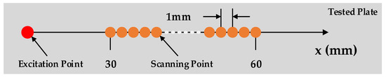 The driving ability of a pure fundamental A0 mode at the selected incident angle by the air-coupled ultrasonic transducer, and the ability to acquire the wavefield in the plate by the full-field laser vibrometer are tested. The distance between the air-coupled transducer and the plate surface is about 40 mm. The wavefield u(t, x) of the Lamb wave in the plate is obtained by linear scanning of the laser Doppler vibrometer. The scanning range is about 30 mm~60 mm from the excitation point, with an interval of 1 mm, as shown in Figure 3.