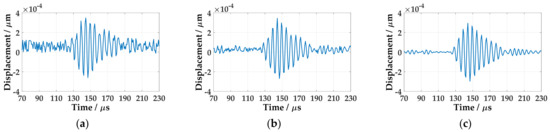 The time-domain waveform data from the 40 mm are selected to analyze, as shown in Figure 4. It can be seen that the signal noise in one acquisition is large, as in Figure 4a. The random noise is reduced after averaging 32 times of data, as in Figure 4b. After band-pass filtering, the noise is further reduced, as in Figure 4c.