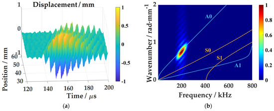 Test results of 2 mm thick CFRP plate: (a) Lamb wave one-dimensional time domain wave field; (b) Frequency-wavenumber spectrum.