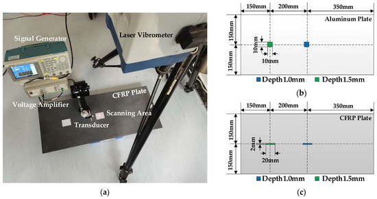 The aluminum plate and CFRP plate are tested in the experiment. The damages are processed on the surface of plates by cutting grooves. The cutting depth is 1 mm and 1.5 mm respectively. The preset damage size of aluminum plate is 10 mm × 10 mm × 1 mm and 10 mm × 10 mm × 1.5 mm, and the preset damage size of composite plate is 20 mm × 2 mm × 1 mm and 20 mm × 2 mm × 1.5 mm. The scanning range of the aluminum plates is 40 mm × 40 mm, and the scanning range of the composite plates is 60 mm × 20 mm. The scanning center point is coincident with the damage center point, the sampling point interval is 1 mm, and the sampling frequency is 1.25 MHz, the total sampling time for one scanning point is 500 μs.