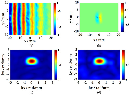 The spatial window function is used to cut the time–space domain wavefield. Figure 11a,b are the overall wavefield at t = 136 μs and the windowed wavefield with the (0,0) coordinate point as the center. Subsequently, the data are subjected to a three-dimensional Fourier transform to obtain wavenumber distribution diagrams at various frequencies. Figure 11c,d are wavenumber distribution diagrams at 200 kHz and 220 kHz. The maximum value of the wavenumber at each frequency is averaged as the actual wave value of the current coordinate point, thereby the wave number diagram of each position in the space is obtained, which can be used to characterize the damage.