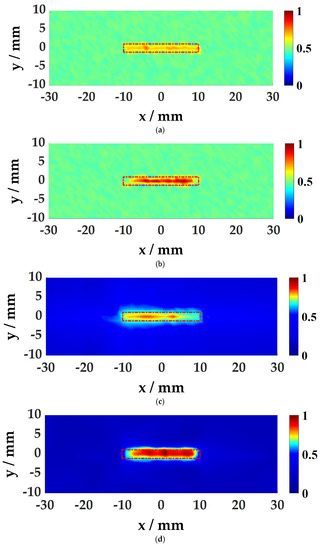For the two square damages in the aluminum plate, the imaging error δ1 is represented by the average of the length measurement errors in the x and y directions. For the damage of two rectangular cracks in the CFRP plate, since the real length in the y direction is too small, only the length measurement error in the x direction is chosen to represent the imaging error δ2.
