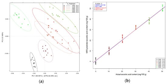 Multivariate analysis from the ascorbic acid spectral data after SG and SNV pretreatment: (a) PCA plot of ascorbic acid within 1300–1600 nm wavelength, (b) PLSR plot of ascorbic acid after 6-fold cross-validation, and (c) PCs loading plot of ascorbic acid.