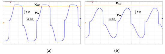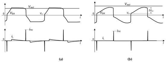 Figure 6 shows the waveforms of the voltage VBA and current iL of the circuit in two different modes. As shown in Figure 6a, the proposed circuit operates in the P-SSHI mode. In this mode, the energy is transferred to the load either in the period when the FB rectifier works or when the resonant circuits run. However, if the proposed circuit is in the S-SSHI mode, the energy is transferred only in the period when the resonant circuits run, as the PE voltage cannot attain the rectified voltage of Vrect, as shown in Figure 6b. The circuit’s two operating modes depend on the open circuit voltage Voc, the voltage flipping process, and the rectified voltage Vrect. In Section 3.3, two resonant loops used during the voltage flipping are modeled to analyze the circuit’s operation mechanism.