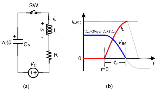 Figure 7 shows the operation of the first resonant loop to extract power from the PE transducer. Here, the switch SW represents the switch S1 or S2 in Figure 4, and VD models the forward voltage of the one diode inserted in the resonant loop. When the switch SW in Figure 7 is ON, using Kirchhoff’s Voltage Law, KVL equation of the circuit model in Figure 7a is: