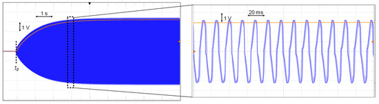 Next, we tested the cold start of the proposed circuit. At t0, the excitation signal is applied to drive the shaker to excite the PE transducer. As shown in Figure 14, after t0, the PE voltage amplitude increases slowly from 0 V to 3 V, and so does the rectified voltage Vrect. The zoom-in waveform on the right shows the detail. It verifies that the circuit has the capability of cold start.