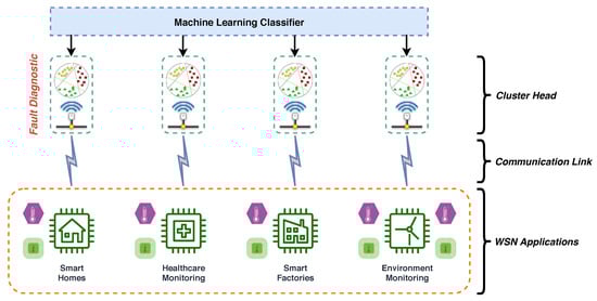 In this work, a new Context-Aware Fault Diagnostic (CAFD) scheme towards the detection and diagnosis of faults or anomalies in sensors is employed. First, the data under consideration are multi-labeled according to the context of the fault. These data samples are then given as input to the context-based ML classifier to diagnose. Upon diagnoses (or classification), the output of the context-based classifier, along with the original data samples (or sensor output signals), are given as input to a fault-based ML classifier. Finally, the fault-based classifier categorizes the data samples in order to detect and diagnose any abnormal behavior occurring in the network. The proposed scheme is discussed in detail in Section 4, and the general architecture of the proposed system is presented in Figure 2. Multiple sensors data from distinct applications communicated to cluster heads through wireless links are shown, where a lightweight ML classifier (Extra-Trees) is deployed for timely detection and diagnosis of faults.