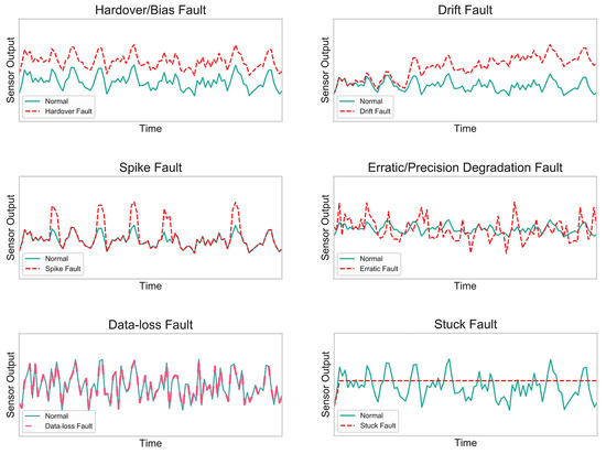 Faults are considered to be a divergence from normal operation in sensor output. These faults can be transient, persistent, or intermittent, depending upon the situation [25,26]. Network congestion, intricate conditions, low-quality production, and aging of the sensor are considered prime reasons for defects [27,28]. Sensor faults are categorized under the trend in which they diverge from normal operations. Mathematically, a normally operating sensor can be expressed by Equation (1):