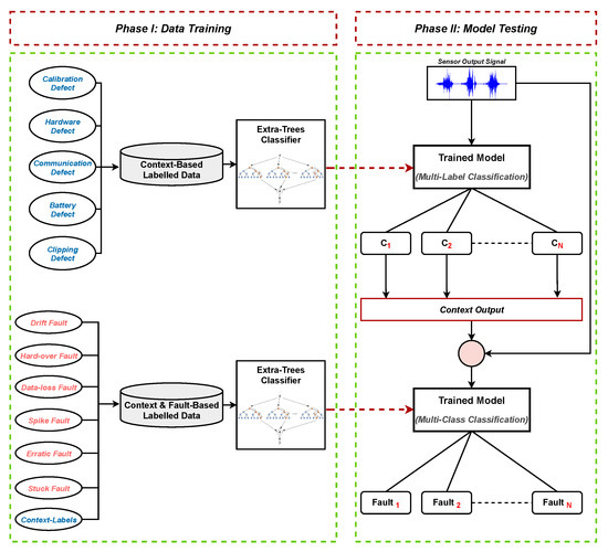 Afterwards, the output of the context-based classifier in the form of labels is utilized as input features in the fault-based classifier. The fault-based multi-class data contain legitimate and faulty data samples along with the additional features from the context-based classifier. Furthermore, the fault-based multi-class data, labeled with normal and data-centric faults classes as mentioned above, are used to train the ET classifier.