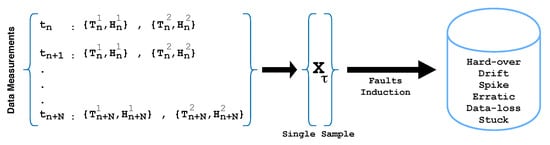 To evaluate the performance of ML classifiers, the data under consideration play an essential role. It is ideal to get data with genuine faults obtained from realistic scenarios. There are no publicly available datasets that in fact address all the faults in sensors. To conduct this research, we acquired a dataset published by the researchers at the University of North Carolina [32]. This dataset is composed of humidity and temperature sensor measurements. The data were acquired through Telos-B motes while creating single-hop and multi-hop WSN scenarios. For this research, we obtained the multi-hop data (only healthy measurements) and injected it with the six diverse sensor faults: drift, hard-over, spike, erratic, stuck, and data-loss. This approach is common among researchers needing to obtain faulty datasets [17,18,19].