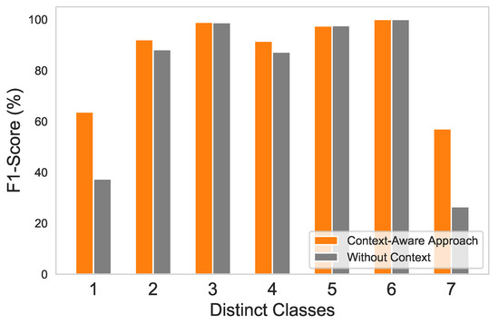 ET average F1-score comparison for distinctive classes using context-aware approach vs. without-context approach.