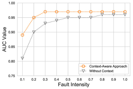 In Figure 9, the ROC-AUC for ET versus different fault intensities under the proposed scheme is revealed. Starting from the lowest fault intensity, 0.1 up to 0.3, the ET-based context-aware approach AUC value increased considerably. The lowest AUC value noticed was . However, from 0.3 to 1.0, the proposed approach constantly achieved the maximum AUC value, up to . On the other hand, the same classifier (ET) in the without-context approach with hyperparameters identical to those in the context-aware approach revealed low performance, up to , whereas with the increase in fault intensity, the ROC-AUC was also elevated.