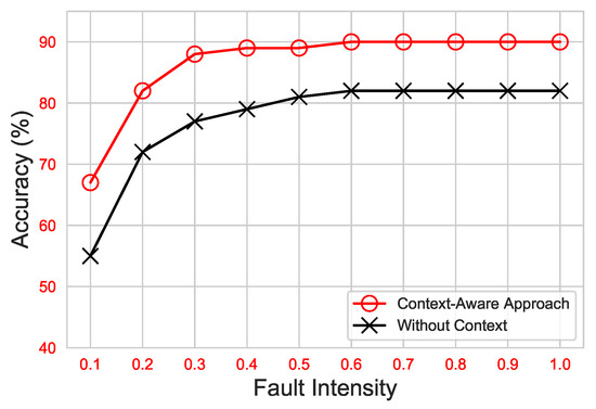 Figure 10 shows the average DA of the approaches under consideration. As can be seen, both approaches significantly improved with the increase in fault intensity. Nonetheless, utilizing the ET classifier, the proposed context-aware approach achieved a maximum accuracy of up to , whereas the without-context approach had the utmost DA, up to .
