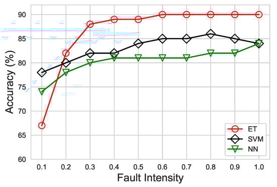 Furthermore, the DA of ET, SVM, and NN classifier at different fault intensities are shown in Figure 11. As the intensity of fault decreases, the disparity between normal and faulty data points reduces, so the performance of algorithms also diminishes. Moreover, an abrupt drop in accuracy for ET can be noticed at a fault intensity of 0.1. This is due to the reason that ET retreats data observations without replacement and uses a random splitting technique while training. This random nature of ET during training causes deterioration at an intensity of 1.0. Nevertheless, this limitation can be easily overcome by increasing a small amount of data observations at low intensity if needed. Overall, ET has attained the highest DA, up to , compared to SVM and NN. This observation reveals that ET can achieve high classification accuracy for a multiple class problem by significantly reducing bias/variance error.