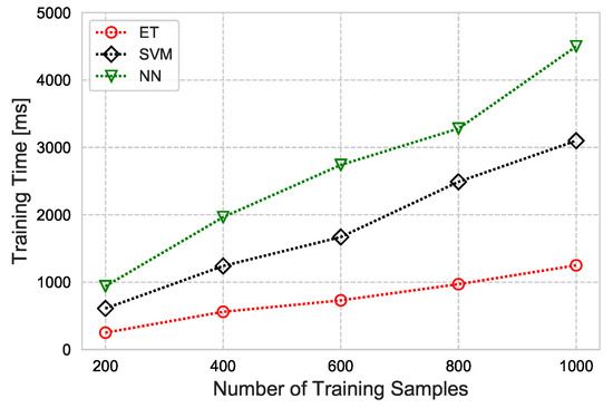 Training time based on the number of training samples for ET, SVM, and NN.