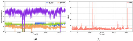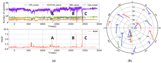 Experimental environment. (a) Number of common-view satellites of the base station and the rover station and PDOP of the rover station satellite. (b) Sky plot.