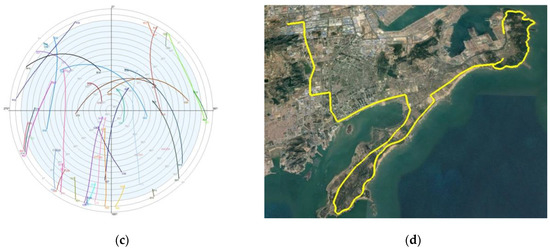 The GNSS receiver used was NovAtel ProPark6, which can realize the data collection of GPS, BDS, and GLONASS data. The sampling frequency was 20 Hz, and the GNSS antenna type was NOV703GGG. The reference station was set up at a known point in the marine survey comprehensive experimental field of Shandong University of Science and Technology, with an open surrounding environment. The data collection time of the mobile station was approximately 2.5 h, the baseline length typically exceeded 10 km, and the satellite suffered lock loss in several places. The experimental trajectory on Google Earth is displayed in Figure 4d. Combining the number of common-view satellites of the base station with the rover station in Figure 4a, the position dilution of precision (PDOP) of the rover station satellites (Figure 4b) and the sky plot (Figure 4c), further reflects the experimental environment. In the experiment, according to Table 1, the accelerometer random walk was set to , and the gyroscope random walk was set to , which is used to set the system noise matrix. According to the observation accuracy of the GNSS receiver,, and were set to , and respectively. In this study, the NovAtel high-precision integrated navigation post-processing software Inertial Explorer 8.90 was used to perform DGNSS/INS tightly coupled smoothing in both directions, and the navigation result was used as a reference value.