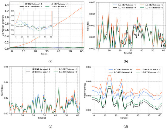 Root mean square error (RMSE) of tightly coupled and loosely coupled systems under different observable satellite numbers for 1 min: (a) 3D position error, (b) roll error, (c) pitch error, and (d) heading error.