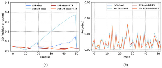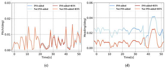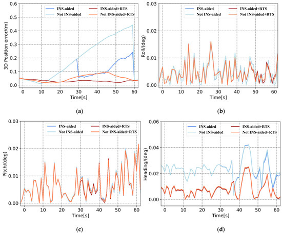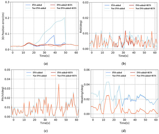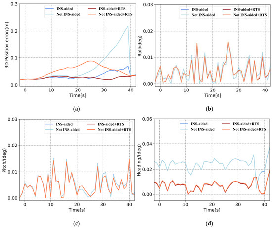 Comparison of Plan 4 with and without INS-aided pose error. (a) 3D position error, (b) roll error, (c) pitch error, and (d) heading error.