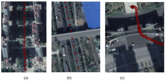 To verify the performance of the tightly coupled post-processing solution strategy in this study in an urban environment, data from the final hour of the Qingdao medium and a short baseline experiment were intercepted. Then, the tightly coupled solution without INS-aided IAR (Method 1), the tightly coupled solution with INS-aided IAR (Method 2), and the tightly coupled solution strategy in this study (Method 3) were used to process the data. Figure 12 displays the experimental observation environment. The total number of common-view satellites of the base and rover stations stabilized at approximately 16 in most periods, and the satellites frequently suffered lock loss during certain periods. The experimental trajectories at jumping points A, B, and C marked in Figure 12, Figure 13, Figure 14 and Figure 15 correspond to the three experimental trajectories in Figure 13. At jumping point A, there are tall buildings, and the satellite changes quickly. At this time, the observation structure is poor, and there are many integer ambiguity reinitializations. At jumping point B, the test vehicle passes a viaduct, causing the GNSS signal to suffer complete lock loss. When relocking the satellite signal, the satellite geometry is poor, and the observation accuracy is low. At jumping point C, the test vehicle passes through the south gate of Shandong University of Science and Technology, and the upper beam of the door is wide, and hence shields the GNSS signal.
