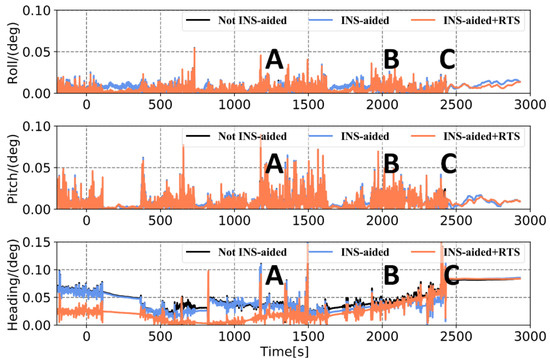 In Figure 14 and Figure 15 and Table 6, it can be seen that when the observation environment and number of visible satellites are sufficient, the position errors acquired by the three solutions are maintained at the centimeter level. Of these, the position curve obtained using Method 3 is smoother, and the attitude accuracy is improved, the heading accuracy improvement is the greatest. At jumping points A, B, and C, the position and attitude accuracy are affected to varying degrees. The 3D position RMSE calculated using Method 1, 2, and 3, was 0.063 m, 0.054 m, and 0.049 m, respectively; meanwhile, the maximum error is 1.159 m, 0.374m, and 0.253m, respectively. Compared with the other two methods, the accuracy of the attitude calculated using Method 3, especially that of the heading, is significantly improved. Therefore, the solution strategy in this study effectively limits the increase in position and attitude errors when the satellite is out of lock by sufficiently utilizing the observations before and after the satellite signal occlusion period. This is an effective means to improve the positioning and attitude accuracy of the GNSS/INS integrated system in an urban environment.