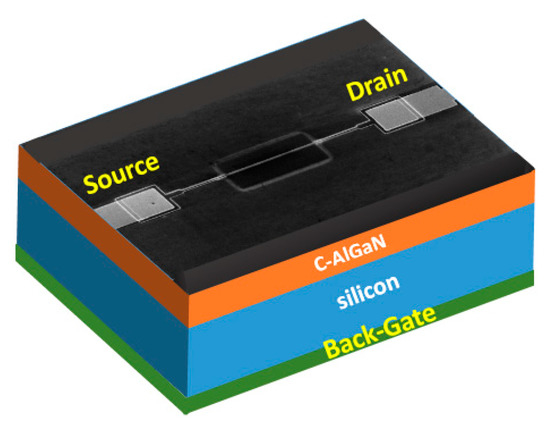 Here, GaN nanowires were made from the Si-doped GaN epilayer using the top-down fabrication process. They were developed on a silicon substrate with a combination of industry standard stepper lithography and inductively coupled plasma (ICP) etching of a GaN/AlGaN epilayer grown on a Si substrate. The nanowire size was observed as being quite uniform. Having a length and a width of ~10 µm and ~400 nm, respectively. Subsequently, ohmic metal contacts composed of Ti (40 nm)/Al (80 nm)/Ti (40 nm)/Au (40 nm) were deposited upon the nanowire. Next, a passivation layer of SiO2 was formed on the nanowire device using the standard plasma-enhanced chemical vapor deposition (PECVD) technique. Later, a functionalization window on the GaN nanowire was developed by reactive-ion etching (RIE) of the SiO2 layer. A thin layer (5–10 nm) of TiO2 nanoclusters was deposited on the nanowire surface by RF magnetron sputtering followed by rapid thermal annealing (RTA). The fabrication details and process flow diagram of the nanowire-based two-terminal device can be found in our previous papers [16,17,18,19]. The C-doped AlGaN buffer layer (~200 nm) formed in between the GaN epilayer and the Si substrate was used as the gate dielectric here to develop a back-gate FET configuration (Figure 1). This dielectric layer was grown on top of the 300 µm thick Si substrate. To best of our knowledge, this is the first back-gate bias study using AlGaN as a gate dielectric in GaN-nanostructured devices. Finally, the fabricated FET device was placed and wire-bonded to a 24-pin ceramic dual in-line package (DIP).