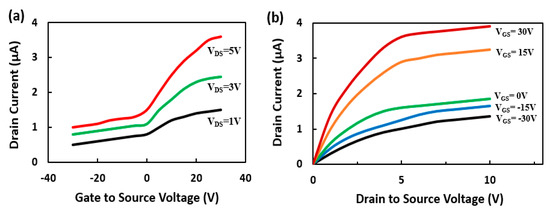 (a) IDS vs. VGS plot for the GaN nanowire-based FET device for a VDS of 1, 3, and 5 V. (b) IDS vs. VDS plot for the GaN nanowire-based FET device with VGS varied from −30 V to 30 V at a step of 15 V. All the measurements were done under UV light at room temperature (20 °C).