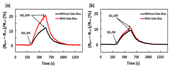 Sensor response to 10 ppm of (a) NO2 and (b) SO2 with and without applying gate bias voltage of 30 V under UV light in dry air at room temperature (20 °C).