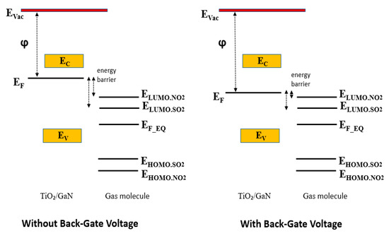 A schematic of the energy band diagram showing the energy barrier between the TiO2/GaN system and the gas molecule is shown in Figure 4. The Fermi energy of the TiO2/GaN system and the HOMO and LUMO of NO2 and SO2 used here were obtained from our previous study on molecular models of adsorption systems using first-principle calculations within DFT [23,24].