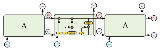 The recurrent neural network (RNN) is the most famous model for training temporal data, but the traditional RNN is difficult to train due to gradient explosion or disappearance. To solve these problems, LSTM uses units with a memory function to replace the hidden units in the RNN [43]. LSTM has long-term memory due to its slow weight changes over time, and can also activate short-term memory in a short-range form. The LSTM structure used in the present study is shown in Figure 3. The core information of the LSTM is transmitted along the horizontal line, and the LSTM forgets the old information and learns the new information via the three gate structures of the forget gate, input gate, and output gate.