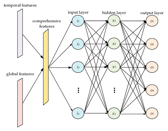 The feature-fusion component used in this study is the MLP structure. As shown in Figure 4, an MLP is usually composed of an input layer, output layer, and several hidden layers. A full connection is adopted between adjacent layers, and a corresponding activation function is set to realize nonlinearity. The features extracted by the CNN and LSTM components are combined into comprehensive features with multi-domain characteristics after flattening treatment and contact operation. The comprehensive features enter the MLP through the input layer, and nonlinear mapping is performed in the hidden layer. Finally, the output layer outputs the predicted classification results. After comparison with the real results, the parameters of each layer are corrected via the back propagation of loss, and model training is completed after several parameter corrections.
