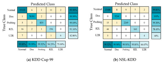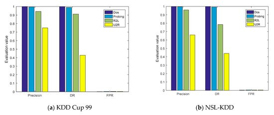 The evaluation parameters of the four types of attacks obtained from the confusion matrices are shown in Figure 7a,b. On the KDD Cup 99 and NSL-KDD datasets, the ACC values of the model were, respectively, 99.95% and 99.79%, and the P values of the DOS and probe attacks were also greater than 99%. However, the detection capabilities of the model for U2R were 71.43% and 50%, respectively, mainly because the number of training samples of U2R was limited, accounting for only 0.01% and 0.04% of the entire datasets, respectively.