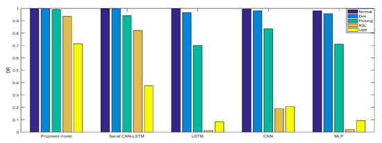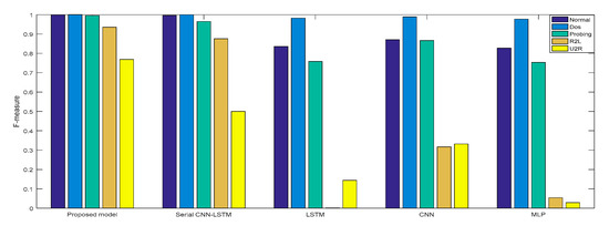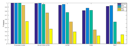 In Experiment 2, the DR and F measure were selected to evaluate the performance improvement of the proposed cross-layer feature fusion CNN-LSTM model. The two datasets were used to train and test the CNN, LSTM, MLP, and serial CNN-LSTM models, respectively, and the test results were compared with those of the proposed model. Figure 10, Figure 11, Figure 12 and Figure 13, respectively, present the DR and F measure of the different models on the two datasets. Taking the KDD Cup 99 dataset as an example, compared with the best performance of the serial CNN-LSTM, the detection performances of the proposed model for the four types of attacks were improved, especially for the detection of U2R; the DR value of the proposed model was increased from 37.50% to 71.43%, and the F measure was increased from 50% to 76.92%.