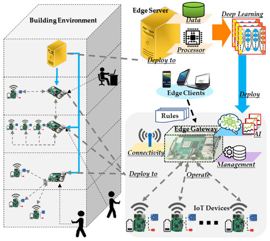 For providing the intelligence in the building environment, the deep learning models are offloaded to the edge server, which derives the intelligent models based on high-performance computational resources and a huge volume of building user data. Then, the intelligent models are deployed to the edge gateway for offloading intelligent approaches to the network edge for operating intelligent scenarios using IoT devices in the building environment. Based on the rules, offloaded intelligent approaches are selected to apply to the building environment for specific scenarios.