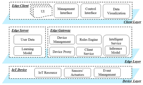The edge layer includes edge server and edge gateway to distribute computing operating IoT devices based on intelligent approaches in the edge of networks. The edge server involves user data and learning models to result in the inference model through training the user data on the learning model. The deep learning models are designed to generate a network that outputs the results by passing the inputs between nodes. The links between nodes of the network are defined by updating the parameters of the links based on a large amount of data. Therefore, a heavy computing process is required, which is supported by the edge server. The inference model is deployed in the edge gateway for deriving a smart result to control the IoT device. For interacting with IoT devices, the edge gateway provides management and device proxy services to link the IoT devices to the cyber world. Moreover, the client service provider enables the users to access the represented virtual object to access actual devices through the Internet.