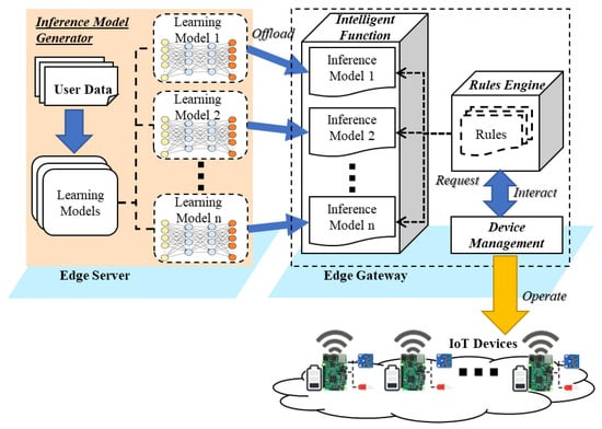 As shown in Figure 4, the IoT device publishes the event to the edge gateway and the rules engine operated the scenario base on the intelligent function. The intelligent function is triggered by the event that is sent from the IoT device. The event is a request message to include sensing data and actuating commands. The rules engine makes the decision to operate an intelligent scenario. Then, the rules engine delivers the event to the selected intelligent function that is provided based on the inference model. The inference model is derived from the deep learning that is developed based on user data.