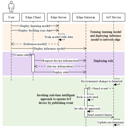 Figure 6 shows the intelligent IoT device operation sequence. The sequence presents the process of training the learning model and deploying the inference model to the network edge. Once the inference model is deployed, the user deploys the rule through the edge client and the rule engine requests to the real-time intelligent service provider to operate IoT devices by publishing events. First, the user deploys the learning model and building user data, and trains the model with the data to get the inference model. The model will be deployed in the edge gateway. Second, the user crates the rule using the edge client through requesting device information and deploying the rule to the edge gateway. Finally, the edge gateway activates the rule to invoke the intelligent service provider and control the IoT device.
