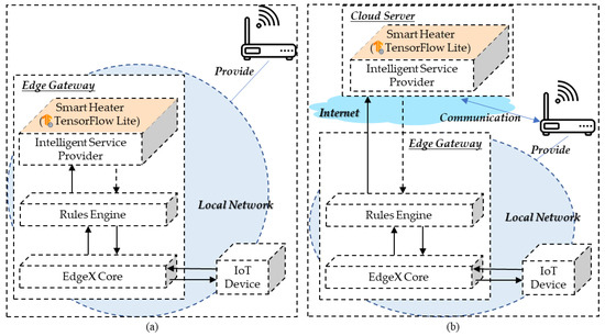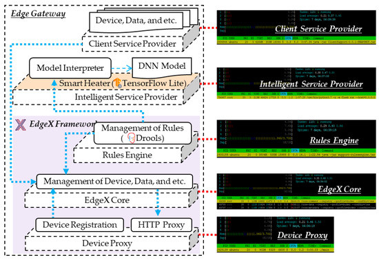 Figure 8 shows the implementation result of the proposed edge gateway, which comprises five microservice providers, including client service, intelligent service, rules engine, EdgeX core and device proxy. The providers run on the edge gateway based on Raspberry Pi 4, which can provide sufficient storage and computing ability. The client service provider provides services to edge clients for visualizing information through UIs and by forwarding the requests to the EdgeX core. The intelligent service provider includes the smart heater model, which was developed using TensorFlow Lite to provide the embedded inference approach through interpreting the DNN model.