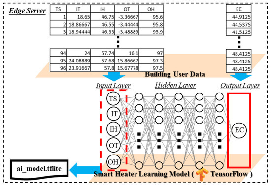 Figure 9 shows the implementation details of the DNN-based inference model that is deployed in the intelligent service provider module to provide intelligent services. The edge server is a high-performance computer that is used for processing the building user data in the smart heater learning model to result in the DNN prediction model. The file ai_model.tflite contains the DNN prediction model that is derived from the smart heater learning model. The learning model is a DNN that is developed in TensorFlow for learning the building user data. The DNN comprises five hidden layers, and each layer has 30 nodes. The input layer has five nodes, including TS, IT, IH, OT and OH, which stand for the time sequence, indoor temperature, indoor humidity, outdoor temperature, and outdoor humidity, respectively. EC is a node in the output layer which stands for energy consumption. The learning model is trained by the building user data. TS, IT, IH, OT and OH are the input of the learning model that derives the EC. The input parameters present the environment where the user is involved. In a status of the environment, the user updates the environment to be a user-desired status using the heater through consuming the energy that is presented by EC. Therefore, we train the leaning model using input parameters TS, IT, IH, OT and OH with the output parameter EC to derive the inference model for providing a value to update the environment to be a user-desired environment. The building user data includes the time sequence, indoor temperature, indoor humidity, outdoor temperature, outdoor humidity and heater’s energy consumption. The data contain 26,208 rows that are collected from 1 January 2014 to 30 September 2014 with 15-min intervals. For training the DNN model with the building user data, the input dimension is (1, 5) and the output demension is (1, 1). The data are applied on the proposed DNN model with 3000 epochs to get a satisfying result for deploying in the intelligent service provider. However, the training process takes several minutes on the edge server; the inference model can derive the result in few microseconds (ms) in the edge gateway.