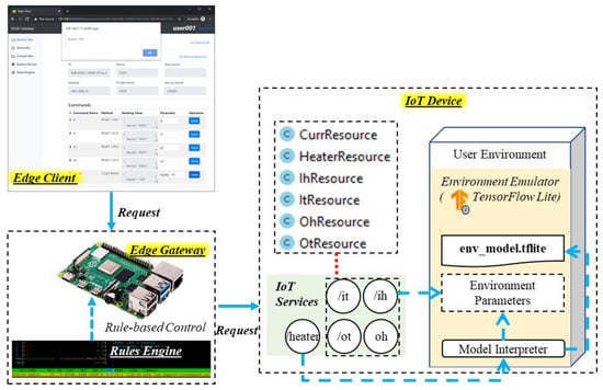 Figure 10 shows the implementation of the IoT device. The requests to the IoT device are sent by the edge gateway through the device proxy. The implemented IoT device provides services through resource classes CuurResource, HeaterResource, IhResource, ItResource, OhResource and OtResource. On the edge of the network, the exposed IoT services are /it, /ih, /ot and /oh for sensing indoor and outdoor temperature and humidity, and /heater for actuating the heater. The IoT device includes an emulator of the user environment that was developed based on TensorFlow lite. The emulator includes a TensorFlow prediction model that predicts the updated environment parameters by the current environment with the heater energy consumption. The IoT device is requested for getting sensing and status data from the edge client, and controlling the heater based on intelligent operation through the rules engine.