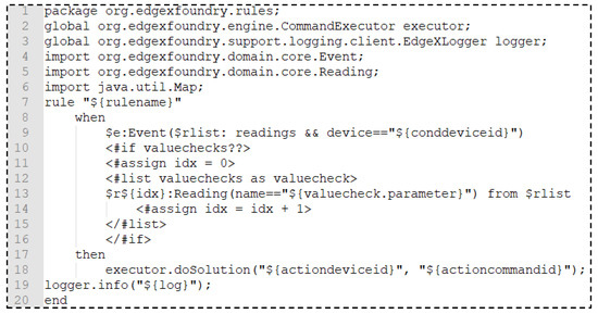 Figure 11 shows the Drools template for creating the Drools profile. The profile is used for operating the proposed intelligent scenarios in the rules engine based on the Drools framework. Once rule information is delivered by the client service provider to the rules engine, the information is converted to a Drools file with file extension drl. The temperate defines the format of the Drools file, which includes the event filter list and objective function. An event comes with the name of the resources, which are defined in the Drools rule for triggering the objective function. The temperate creates a rule with device ID, resource name list, objective device ID and command ID. The device ID and resource name list are used for the rule condition. The objective device ID and command ID are used for operating the goal based on the rule.